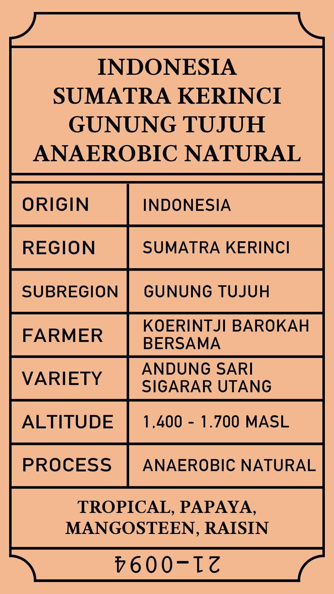 ด้วยล็อต Anaerobic Natural นี้ กาแฟจะถูกลอยและแยกตามความหนาแน่นก่อนจะวางบนเตียงยกสูง ซึ่งพนักงานจะเก็บผลที่สุกเกินไป ผลที่สุกเกินไป และผลเชอร์รี่ที่เสียหาย จากนั้นเก็บเชอร์รี่สุกอีกครั้งและปิดผนึกในถุงพลาสติกสุญญากาศขนาด 20 กก. และเก็บไว้ในที่แห้งและเย็น (โดยมีอุณหภูมิระหว่าง 18 ถึง 22 องศาเซลเซียส) เป็นเวลา 7 วัน